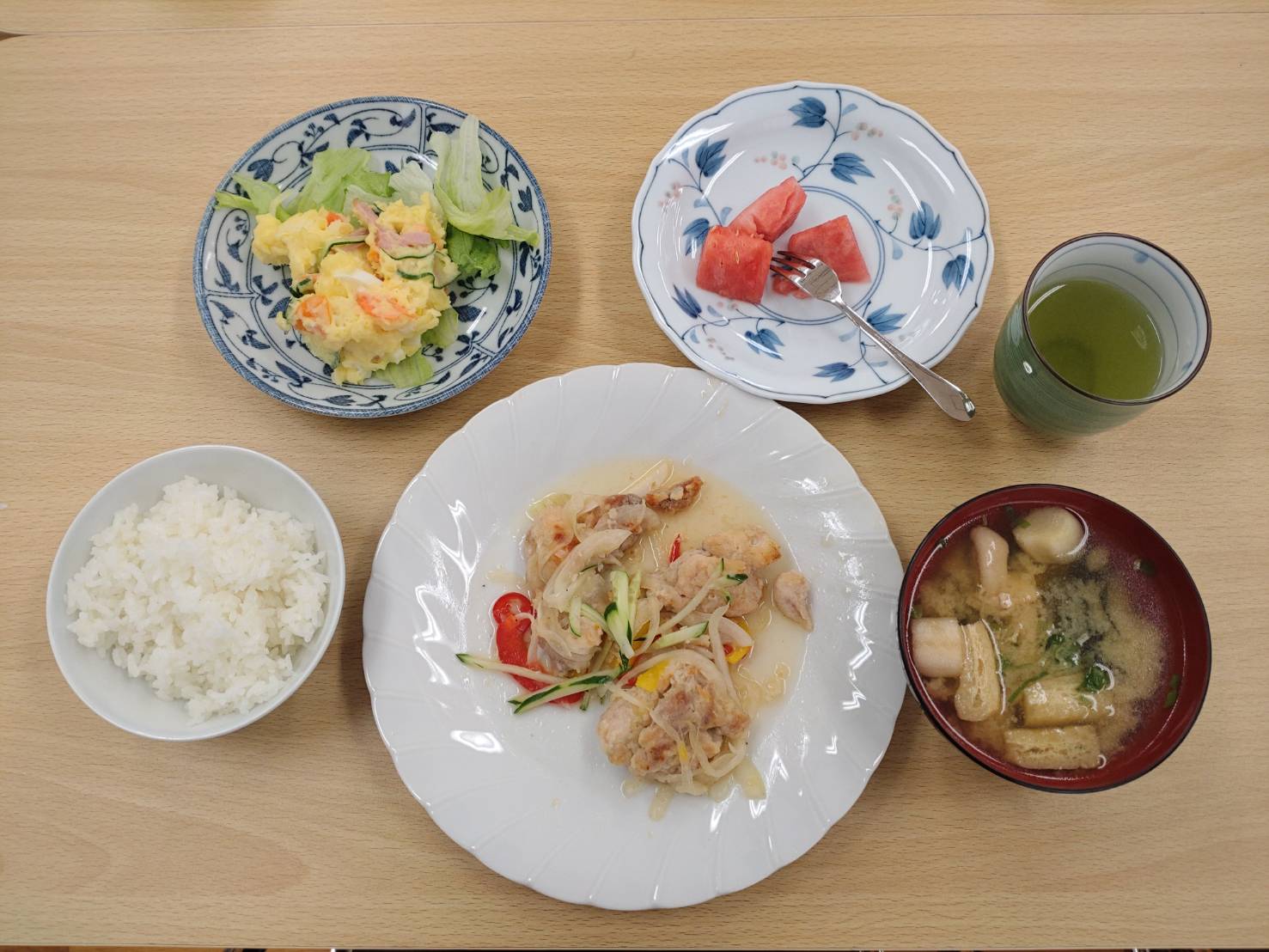 鶏肉のマリネ、マカロニサラダ、味噌汁、スイカ