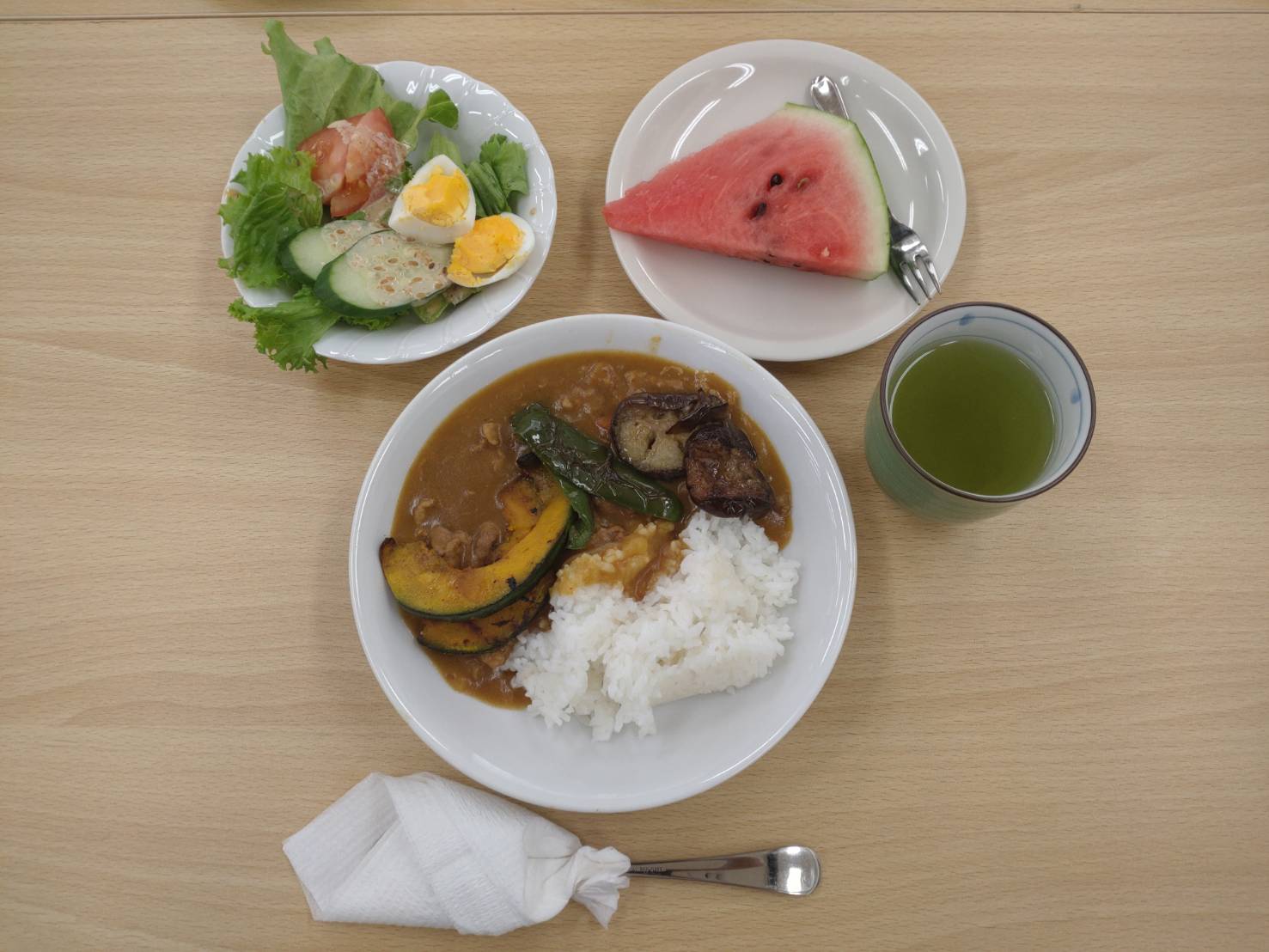夏野菜カレー、サラダ、スイカ