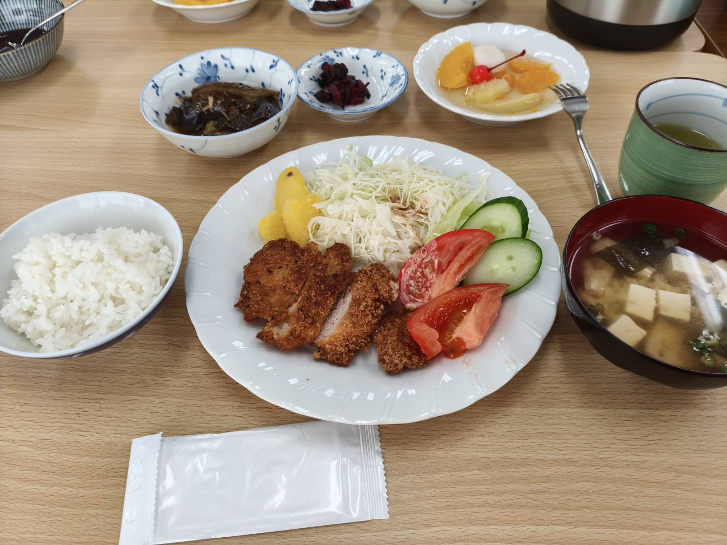 とんかつ、茄子の煮浸し、味噌汁、ご飯、フルーツポンチ