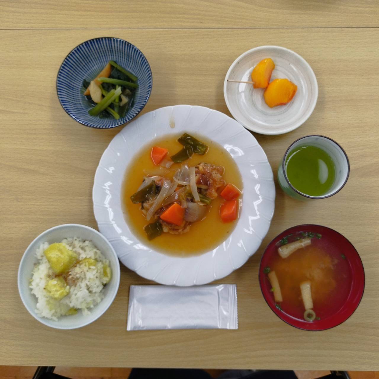 サツマイモご飯、サバの甘酢あんかけ、小松菜の煮浸し、味噌汁、柿
