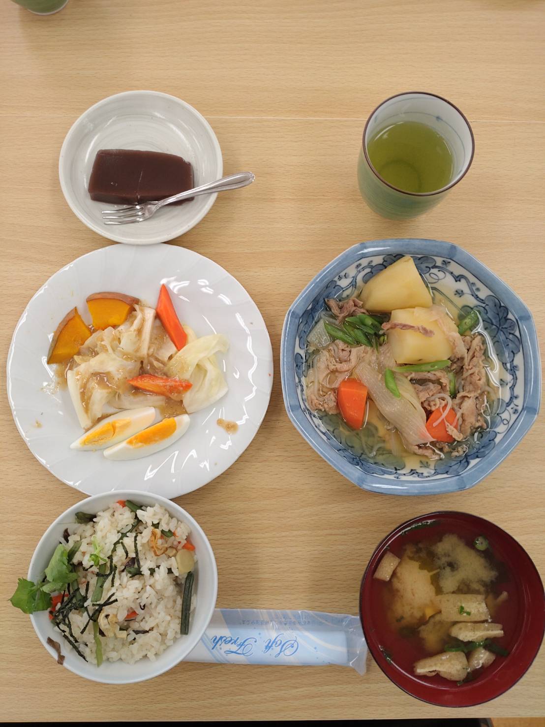 豆ごはん、治部煮、春雨サラダ、味噌汁、コーヒーゼリー