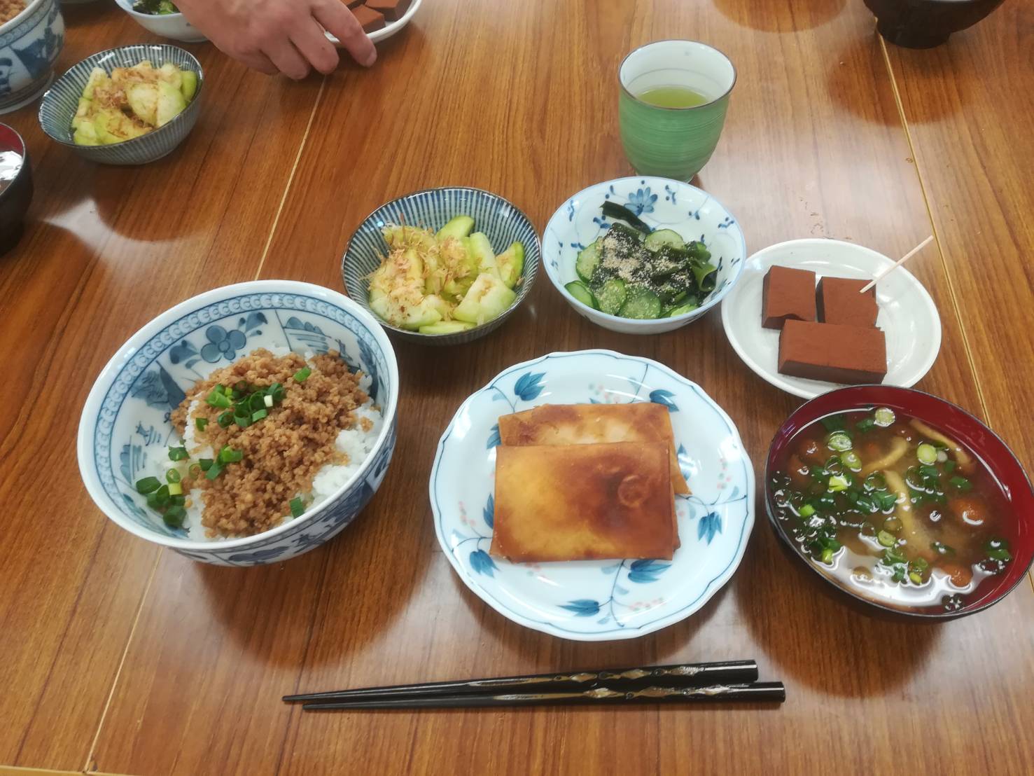 鶏そぼろ丼、ポテトとベーコンの春巻き、わかめときゅうりの酢の物、水茄子の浅漬け、味噌汁、チョコレートプリン